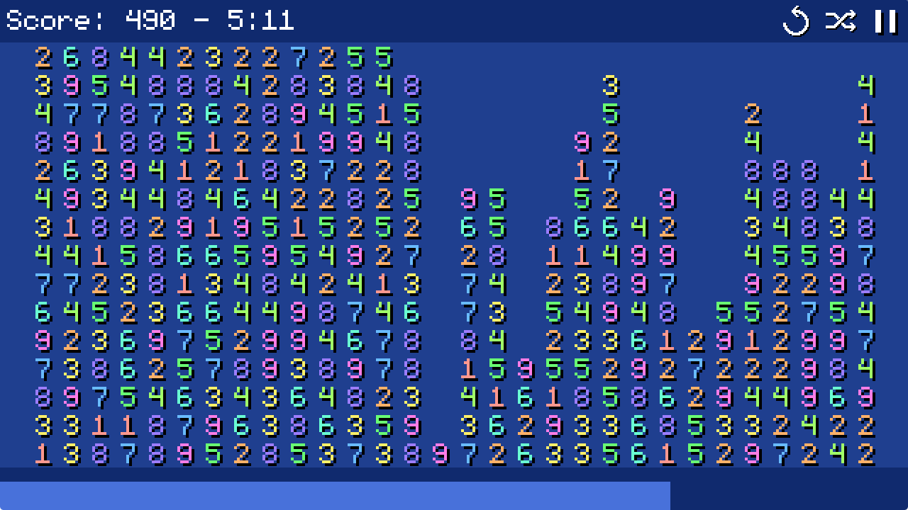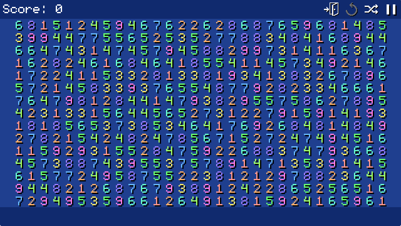A simple but addictive puzzle game. Your mission is to match numbers such that they add up to 10. Simply click and drag with your mouse or tap and drag on mobile to make a selection and make sure the numbers add up to 10!